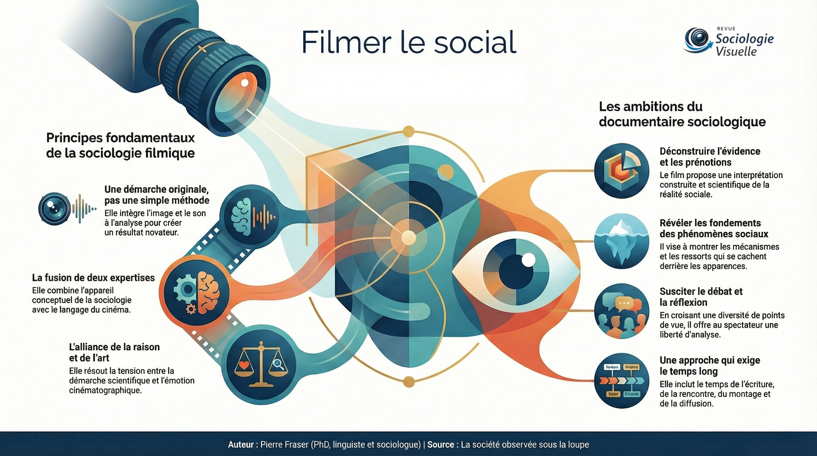La sociologie filmique n’est pas une simple curiosité académique mais une entreprise où se croisent le sérieux de l’analyse sociologique et le langage visuel du cinéma, un hybride savoureux qui transforme la caméra en instrument de pensée et le cadre en laboratoire d’idées. Loin de se contenter de collecter des données ou de vulgariser des savoirs, elle propose une véritable « pensée par l’image », qui ose considérer le sensible et l’émotion non comme des embellissements accessoires mais comme de véritables sources de connaissance, capable de révéler des dimensions sociales que le texte seul peine à atteindre.
