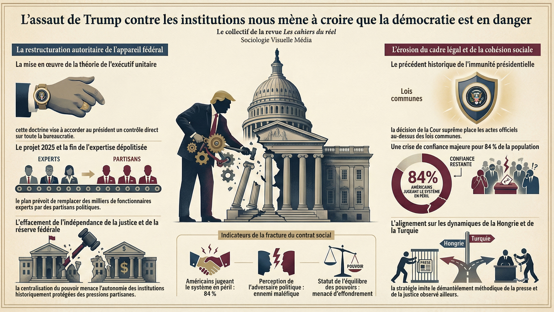 C’est là que réside le véritable danger : Trump ne se contente pas d’attaquer les institutions, il installe une narration où la survie de la démocratie est déjà jugée impossible, forçant chaque acteur (juges, médias, citoyens) à se comporter comme si la fin était déjà actée.